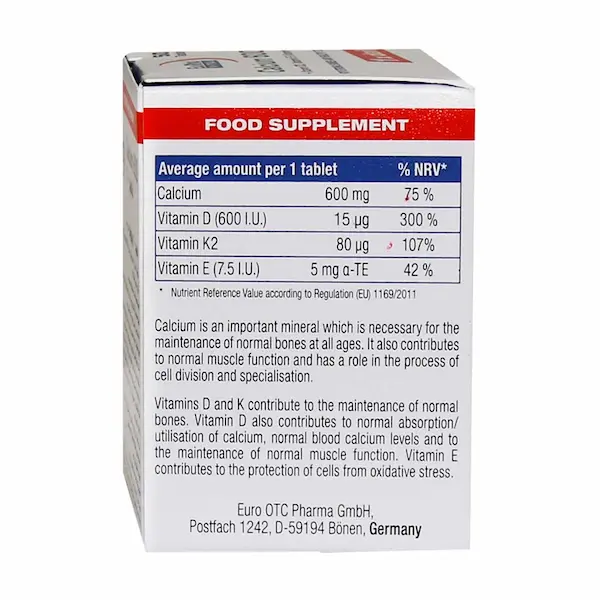 - حاوی 600 میلی گرم کلسیم، ویتامین دی، ای و کا2