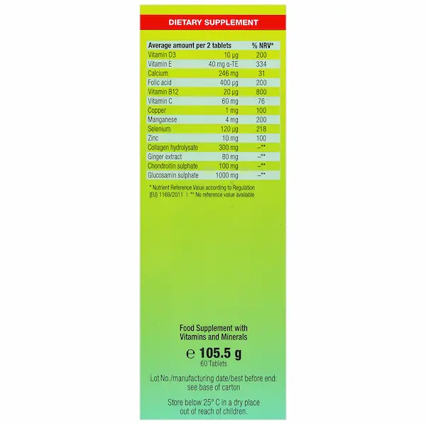 - دارای گلوکزآمین و زنجبیل، کندروئیتین و کلاژن
