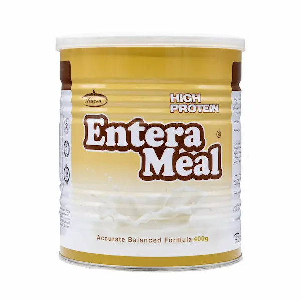 انترامیل پر پروتئین Enterameal High Protein 400gr موزی کارن، حاوی پروتئین غلیظ شده آب پنیر، روغن آفتابگردان، روغن نارگیل، ویتامینها و مواد معدنی، کارنیتین، تئورین و … می باشد که به افراد سالمند، بیماران و … کمک می کند که نیازهای غذایی برای رفع سوء تغذیه آنها برطرف شود. بسیاری از افراد سالمند، بیماران و … نمی توانند به صورت طبیعی از غذاهای روتین روزانه سایر افراد استفاده کنند و به علت مشکلات گوارشی و … تمایل به مصرف غذا ندارند. پودر پر پروتئین انترامیل کمک می کند که تمامی نیازهای غذایی یک فرد سالمند و یا بیمار بزرگسال به غذای روزانه برطرف شود و تمام نیازهای ویتامین و املاح معدنی آنها برطرف شود. پودر انترامیل پر پروتئین کارن با دارا بودن فرمولاسیونی ویژه قادر به تامین نیازهای بدن شما به مواد گوناگون بوده و همچنین به دلیل فیبر بالای خود از بروز اسهال و یبوست نیز پیشگیری می نماید.