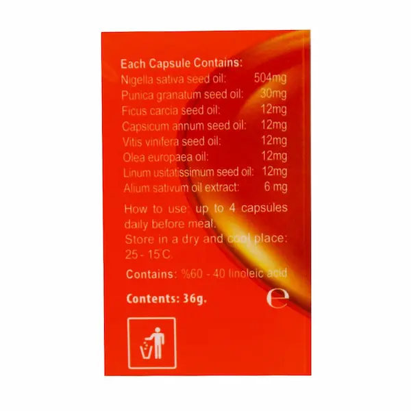 - حاوی روغن سیاه دانه، دانه انار، زیتون، هسته انگور، دانه انجیر، دانه فلفل قرمز، دانه کتان و روغن سیر