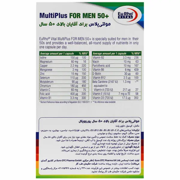 فرمولاسیون این محصول متناسب با نیازهای مردان بالای ۵۰ سال طراحی شده و از برند معتبر یوروویتال است که به کیفیت و استانداردهای اروپایی شناخته می‌شود.