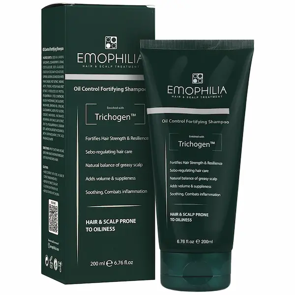 شامپو اموفیلیا موهای چرب (Oil Control Fortifying Shampoo Emophilia) هست که چربی کف سر رو کنترل می کنه و باعث خشکی و پوسته ریزی نمیشه. ترکیبات تقویت کننده ریشه مو عالی داره که در کنار هم باعث افزایش خون رسانی کف سر و تقویت ریشه مو می شوند و از ریزش مو جلوگیری می کنند. عصاره رزماری، بابا آدم و جینسینگ در ترکیبات شامپو اموفیلیا موهای چرب وجود داره که علاوه بر اینکه چربی کف سر رو پاکسازی می کنند بلکه باعث تقویت ریشه مو هم می شند.